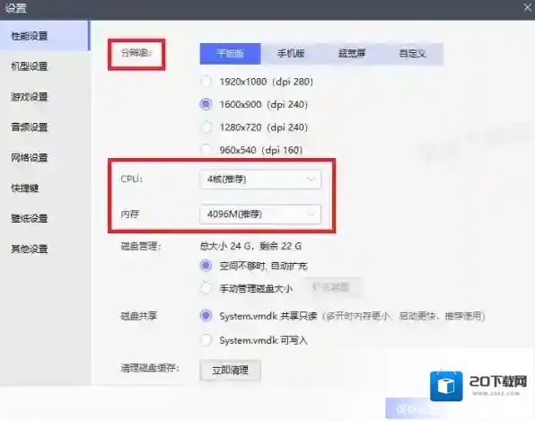 4.在性能设置页面,适当降低分辨率,如果是平板模式,建议选择1600*900或1280*720;然后适当提高CPU核心数和内存,尤其是高配游戏,往往需要更多的CPU资源,需要注意的是,我们对单独的模拟器进行设置的同时,也要兼顾另外一个模拟器。