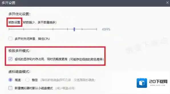 2.根据自身的游戏需求适当降低帧数,模拟器默认是60帧,我们可以降到45帧左右;同时,打开下方极致多开模式选项,提高游戏运行流畅度。