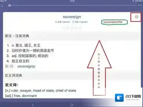 点击其中一个单词,再出来的界面如下图:在这个界面,你可以左右滑动来看前面或后面的单词卡;如果你想知道这个词的具体用法,可以点击空白处来看词典里对这个词的具体解读;还可以让单词卡每隔几秒钟自动翻页,连续浏览。由此可见,欧路词典单词复习模块的强大之处在于,第一个是词库更加实用、多样,第二个是与词典里的扩充词库无缝对接,背词和查词转换非常方便。