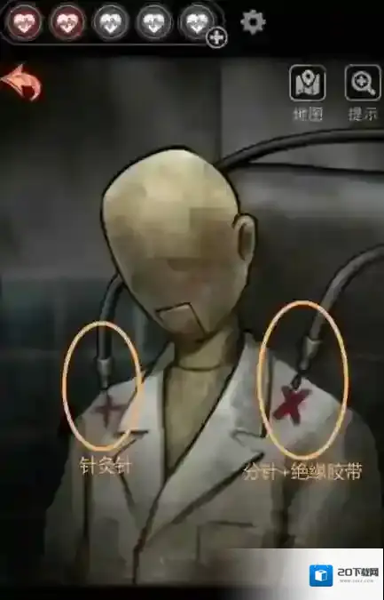 13、接着,我们从窗户上拿到磁铁,然后使用磁铁到右侧场景的墙角缝里拿到针灸针。回到治疗室,使用分针和绝缘胶带制作右侧的针头,使用针灸针制作左侧的针头,然后将两个针头插在人偶的肩上。