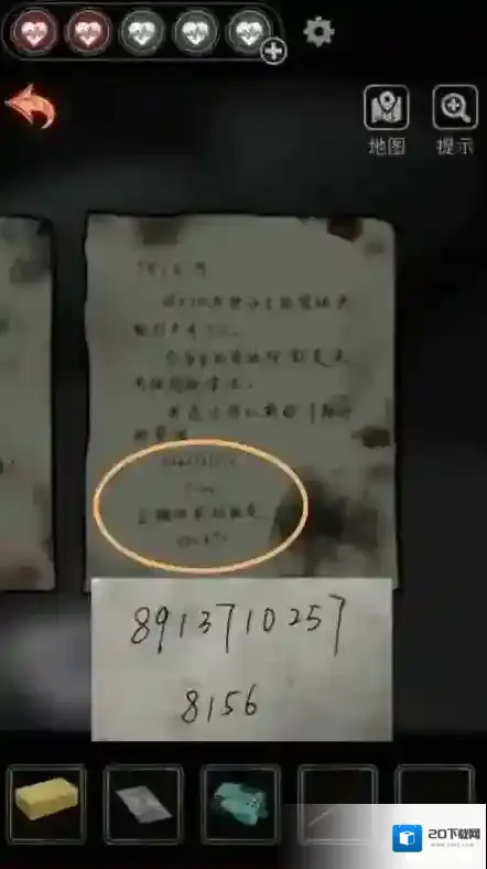 11、转到治疗室的右侧场景,移开床底下的人偶,找到叠纸。结合最后一张纸的提示和柜子上的纸条,输入密码打开柜子。柜子密码为:913707。