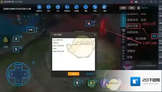 如下图,我们添加一个一键宏按键,标记为“G”,输入指令,按下按键(ondown)触发(1247 260)像素坐标,松开按键(onup),触发(1072 179)像素坐标。设定好之后,在游戏中只需要按“G”按键,就可以直接发送“请求支援”。