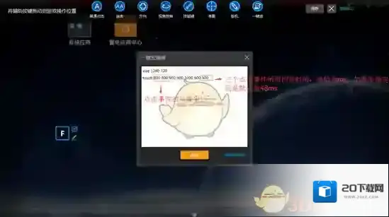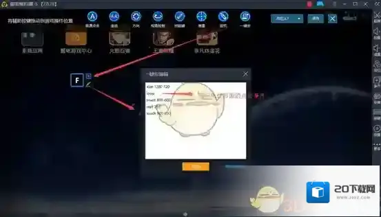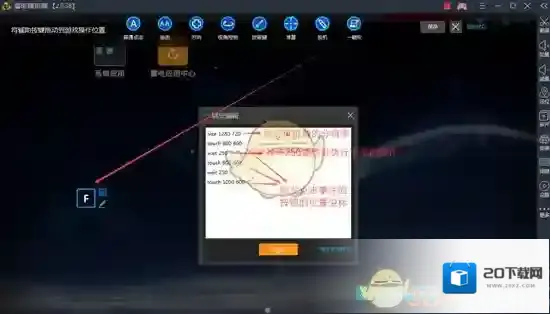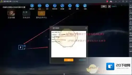 输入指令如下图,这个一键宏的意思是,在分辨率为1280*720的模拟器中,按下F键,系统自动触碰(800 600)(900 600)(1000 600)三个像素坐标的虚拟按键,所用时间为500ms。
