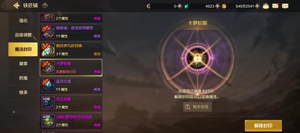 作用介绍30级以上的稀有、神器和史诗装备通过解除魔法封印来获得词条属性。
