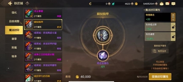 如何变幻词条在魔法封印系统里,稀有和神器装备可以通过消耗金币来随机出自己用到的封印词条,史诗装备每次需要额外消耗一个变换石,特性词条需要宇宙精华单独洗(宇宙精华获取难度很大,不要轻易使用)。