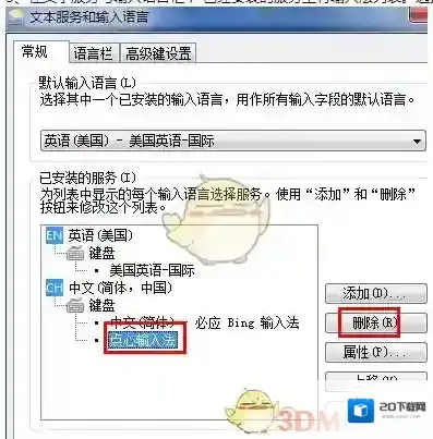 方法六:有些小的输入法会导致浏览器奔溃(例如:点心,速浪,万能,小晨,速拼等)大家可以更换其他输入法或者在在文字服务与输入语言框, 已经安装的服务里有输入法列表。选择需要删除的输入法,点击右边的(删除)