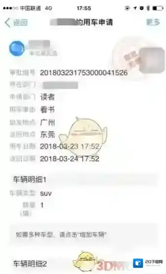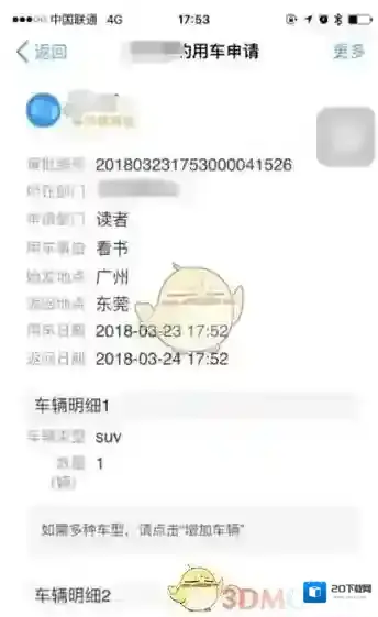5.提交后,用车申请将发送给审批人,审批人可进行同意/拒绝等操作,如下图的底部按钮。