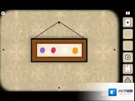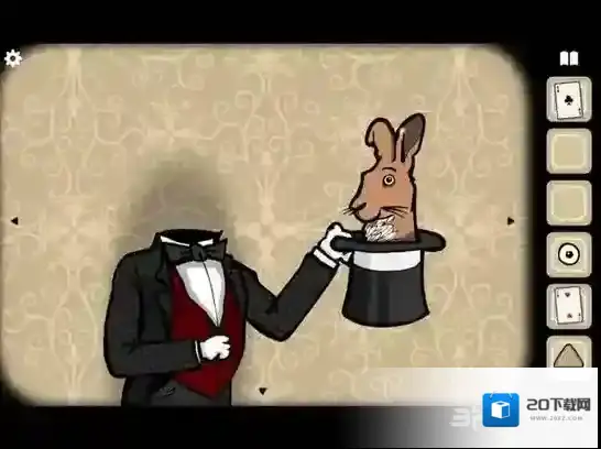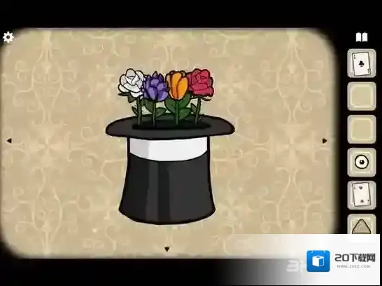 查看兔子先生,给他魔术帽,他会摘下来,查看魔术帽里面变出四朵花。旁边的相框上有提示,按提示摆放花的顺序(摆好的那张忘截了,这里放的是刚刚变出来的花的顺序),摆好后花会伸回帽子里,点击兔头他会在身体和帽子里变来变去(如果我要杀他我就把帽子从窗户里扔出去,头就没了),兔头在帽子里的时候点一下嘴,兔子吐出一把钥匙。