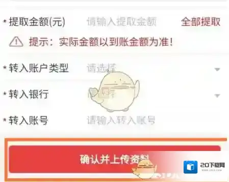 5、如下图,把带“*”号的选项填好(提款金额是有上限的),最后点击“确认并上传资料”按钮;