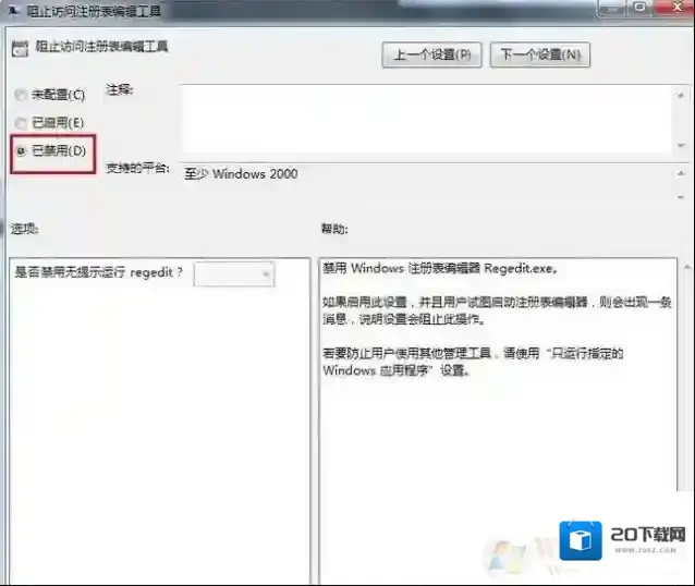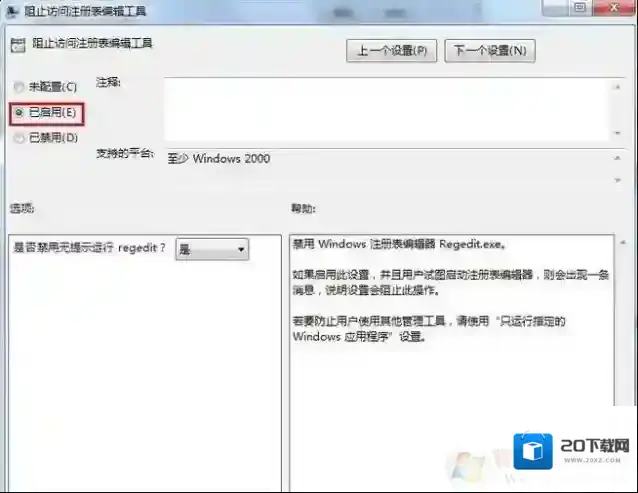 7、如果我们要使用注册表时,可以在阻止访问注册表编辑工具窗口中,把已启用更改为:已禁用,然后点击:确定,就可以解除锁定注册表编辑器;