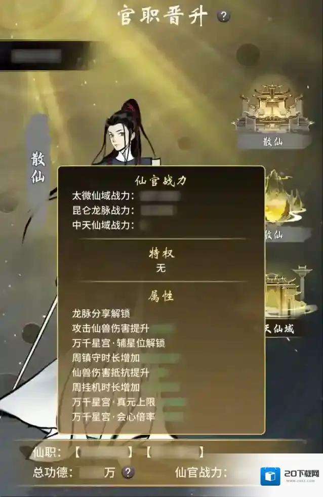 新增仙官战力,通过晋升解锁官职属性,可获得仙官战力,仙官战力仅在仙宫独立展示。