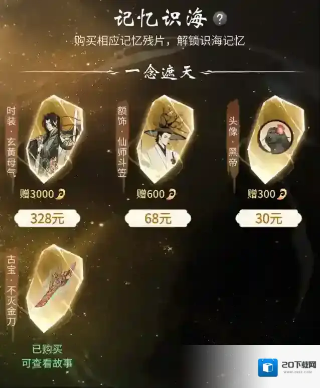 新增记忆识海,阅读完指定章节后解锁。购买识海中时装·玄黄母气、额饰·仙师斗笠、头像·黑帝、古宝·不灭金刀商品,可解锁专属记忆对话。