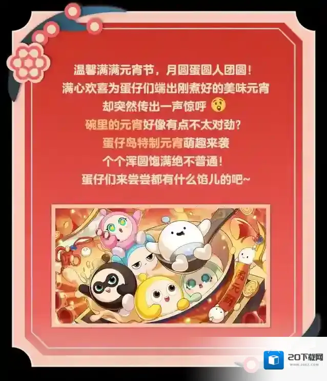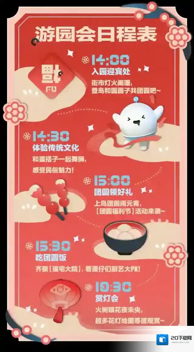 花灯逢元夜,今宵共团圆当蛋仔岛弥漫着甜甜的元宵香味时元宵节的脚步已悄然而至~蛋仔岛元宵游园会盛大开幕!快跟着圆圆子一起看看游园会日程表有哪些好玩的项目在等着蛋仔们呢?