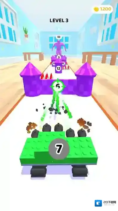 3、玩家驾驶战车发射炮弹,攻击紫色的城堡和机器人等目标,通过精准打击,在规定时间内击破目标,推进游戏进程。