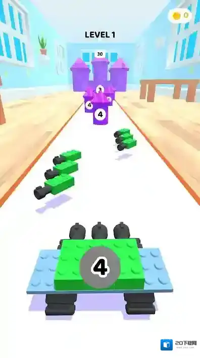 1、游戏设有关卡,玩家操控绿色的积木风格战车在不同关卡场景中前进,完成关卡目标。