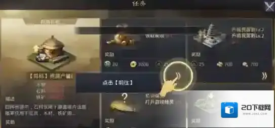 右边任务:从前往后跟着点,领取的金币和资源(木、铁、粮)足够前期开荒发育。
