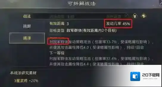 另外,有可能20级了战法不到10级,或者没有材料觉醒,没关系,继续练级,升兵营,到高级地,放弃低级地,提升战力和势力,就是开荒的目的。