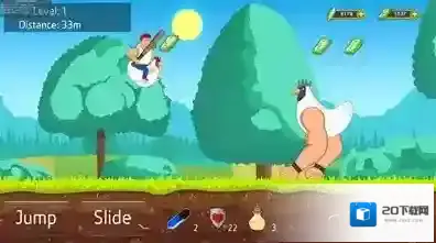 1、界面显示等级、距离,下方有跳跃、滑行、攻击(Attack)等操作按钮,还有类似道具数量显示,画面中有一名手持棒球棍的角色和一个体型巨大的鸡形象敌人。
