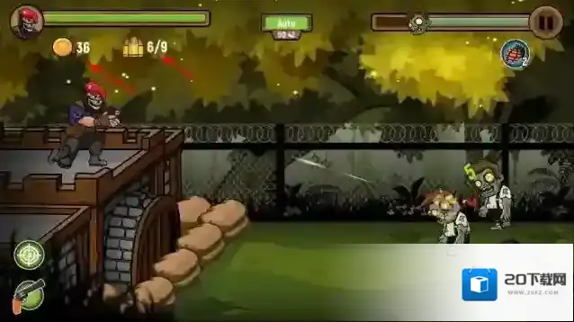 3、“防御阵地”,利用武器(手枪、炸弹),阻止多波僵尸靠近堡垒,守护生存区域。
