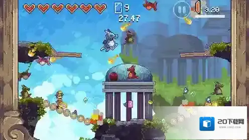 2、注意屏幕上方的生命值,魔法值等数值,操控角色躲避空中怪物,按红色箭头方向前进。