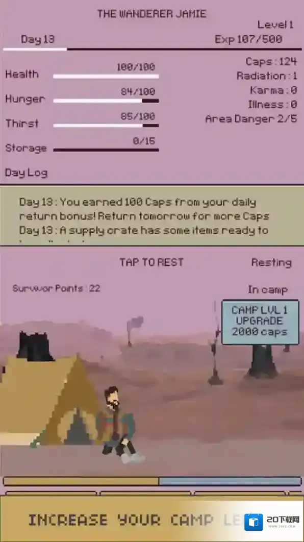 3、在营地,点击休息到第二天,恢复状态,推进Day1进程,积累Survivor-Points,发展角色。