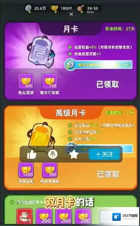 月卡:游戏提供标准月卡、高级月卡等多种选择,具体权益可在游戏页面查看。