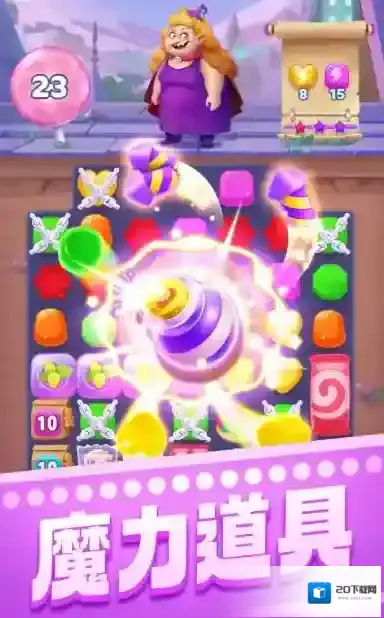 女巫:对于这个胖胖的女巫,大家应该都很熟悉了,基本上主线每5关就会见到她的踪影。本关女巫从第31步开始,每走4步会扔出3个巧克力球,位置随机。单次消除打掉女巫15%的血量,女巫就会被打晕,无法施魔法。