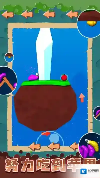 1、进入关卡后观察地形,长按屏幕控制虫子身体弯曲方向,通过蠕动靠近苹果,遇到高台时点击“拉粑粑”按钮生成阶梯,借助阶梯向上攀爬。